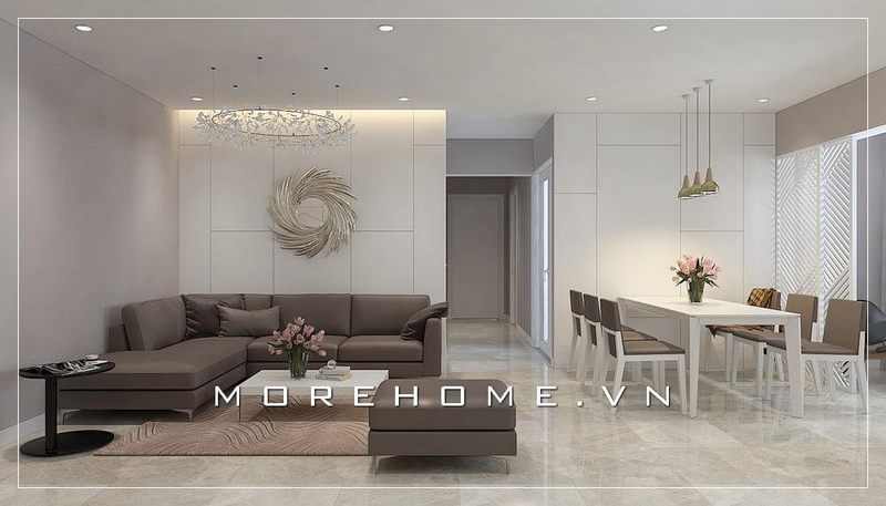 Sofa khung gỗ hiện đại thiết kế kiểu dáng văng đơn giản với phần đệm vỏ bọc vải êm ái màu trắng tinh tế đầy ấn tượng giữa không gian phòng khách căn hộ chung cư.
