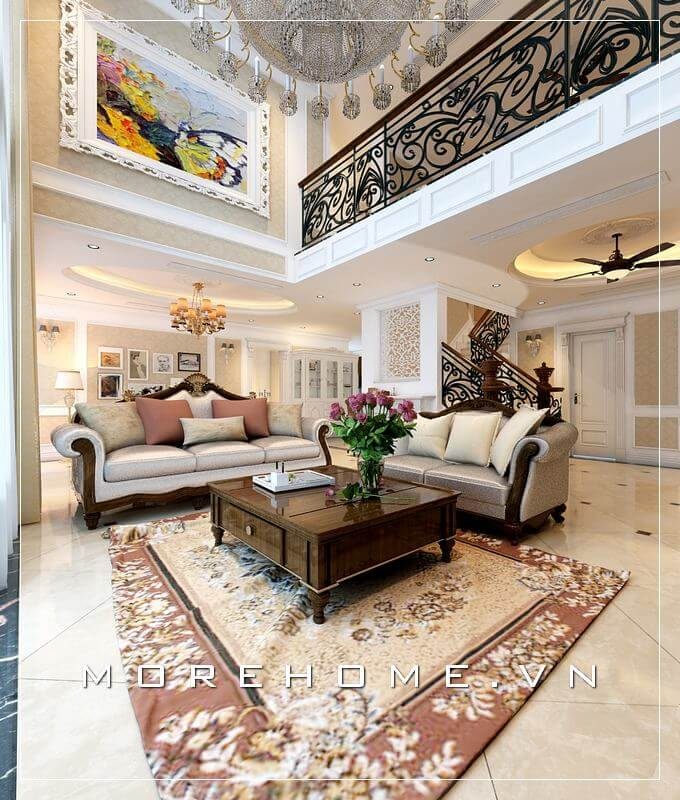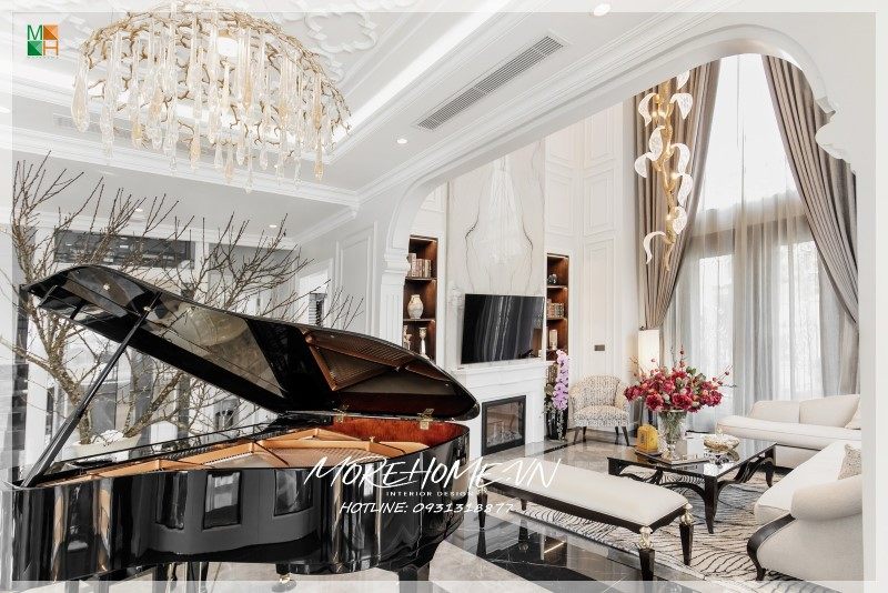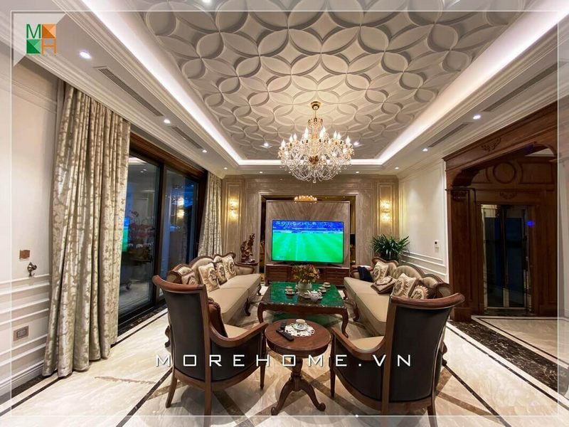 Sự khéo léo trong thiết kế nội thất phòng khách biệt thự tân cổ điển là những chạm khắc tinh xảo của trần nhà hay là kệ TV gỗ tự nhiên, vách tường của TV đến cách lựa chọn rèm cửa và đèn chùm treo trần, tất cả đều rất tinh tế và điêu luyện trong cách thiết kế.