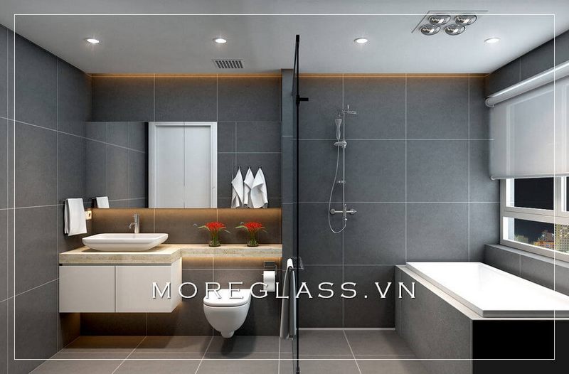 Mẫu thiết kế phòng tắm đẳng cấp được trang bị bằng đá tự nhiên, ốp tường màu trắng vân mây cao cấp sẽ cuốn hút tất cả ánh nhìn.
