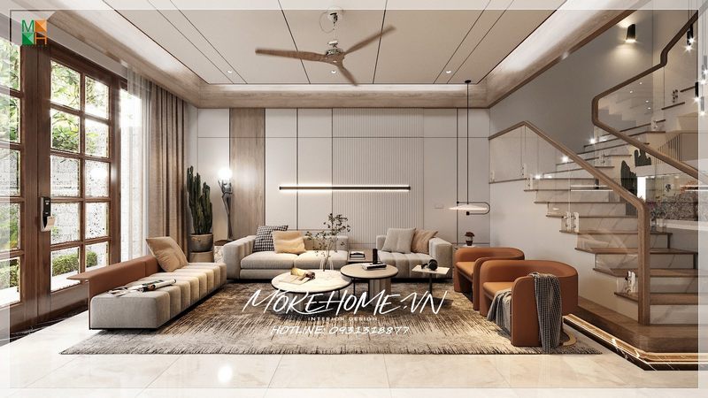 Nhà phố được thiết kế với nội thất gỗ tự nhiên cao cấp giúp phòng khách trở nên sang trọng và gần gũi với thiên nhiên.